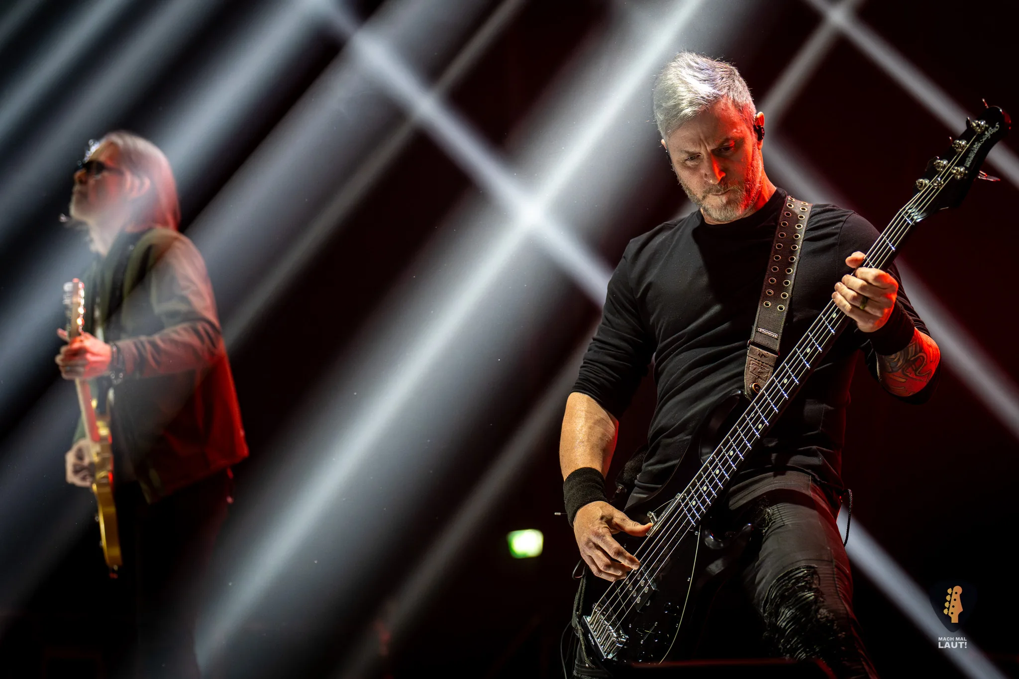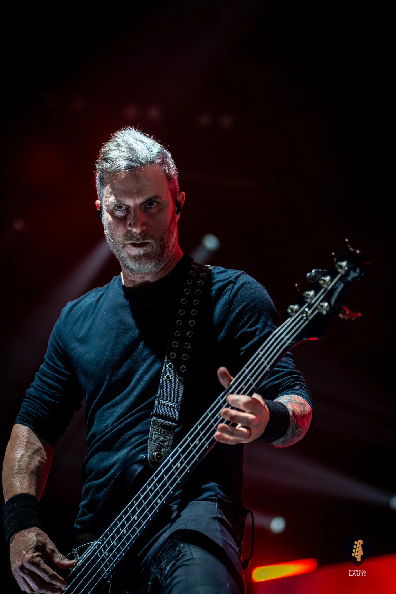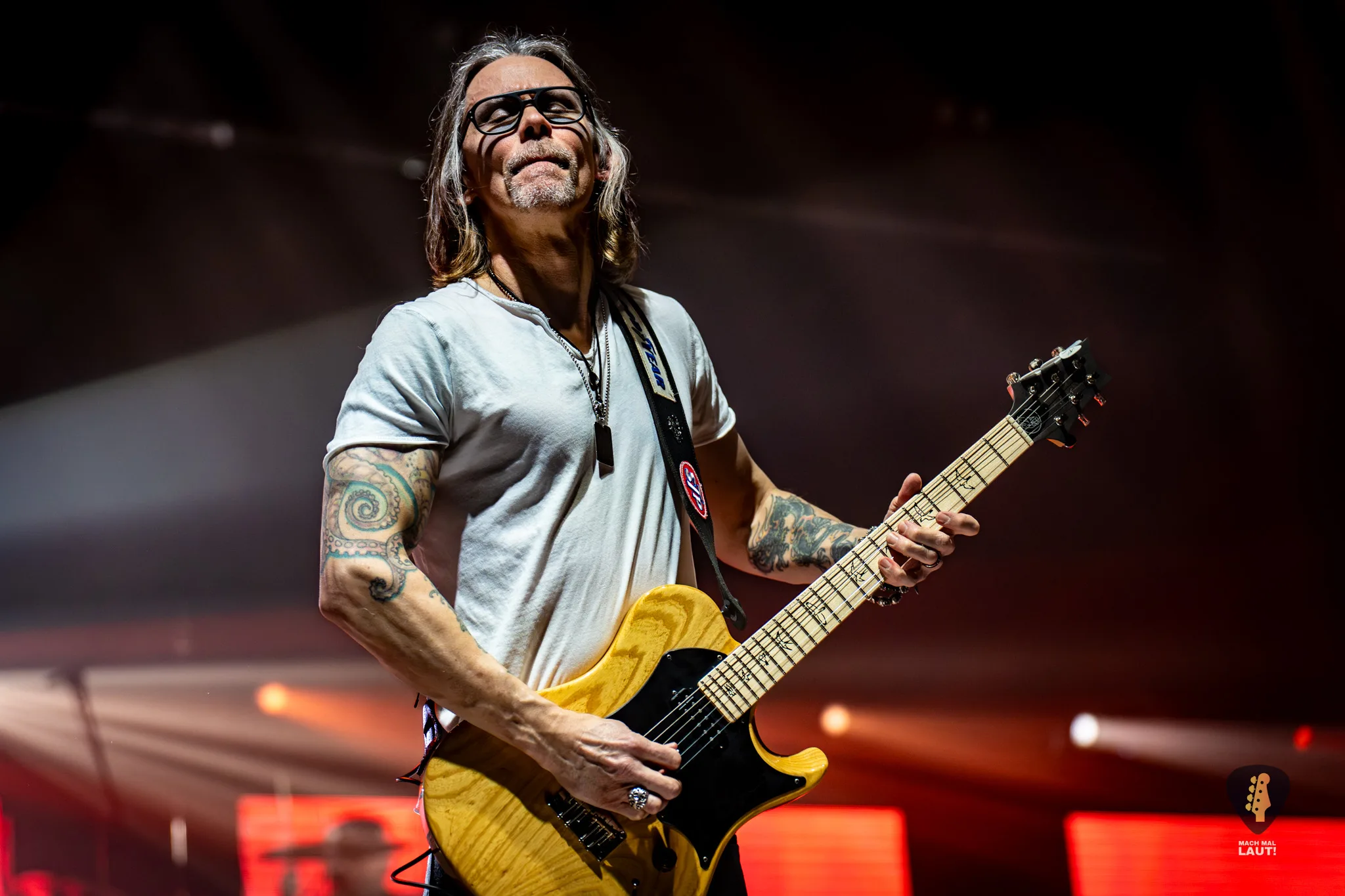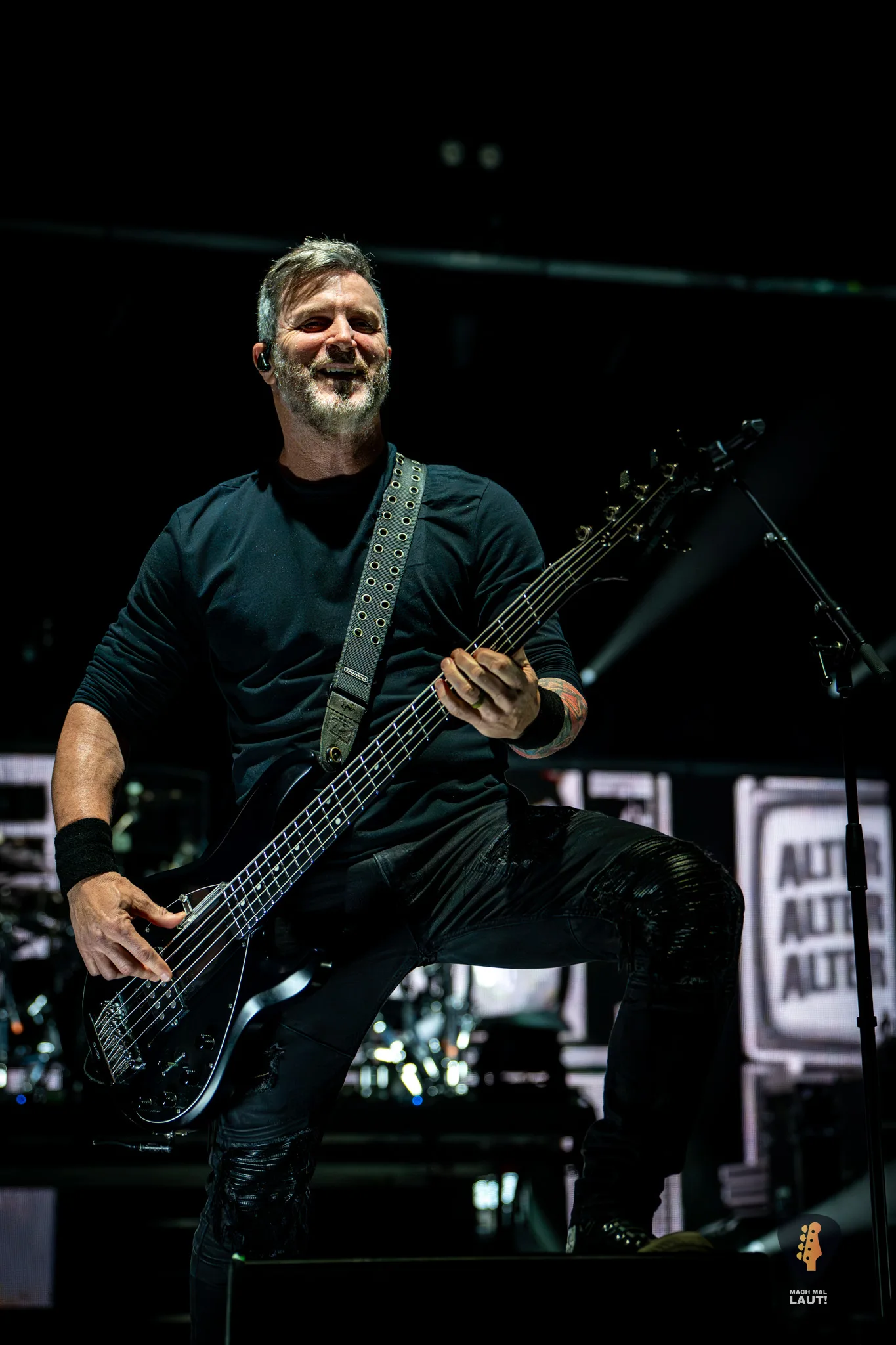Als schließlich Alter Bridge die Bühne betraten, wurde es auch endlich richtig laut in der Halle. Nachdem die Halle bereits den ganzen Abend eingenebelt wurde, kam jetzt die volle Stärke der starke Lichtshow zum Vorschein, die die Alter Bridge Performance begleitete. Die Band war ebenfalls sichtlich motiviert und freute sich wieder gemeinsam auf Tour zu sein. Die Setlist war ein richtig guter Mix aus allen Phasen der Bandgeschichte. Nach dem Beginn mit Silent Divide vom neuen Album Alter Bridge ging es direkt 13 Jahre zurück zum Album Fortress mit Addicted To Pain. Fortress stellte einen echten Fanmoment dar. Der Song wurde das erste Mal seit 2017 wieder live gespielt und wurde zuvor über eine Abstimmung auf dem Instagram Kanal der Band von den Fans für diesen Abend abgestimmt. Bei Burn it down durfte Mark Tremonti das erste Mal an diesem Abend den Gesang übernehmen.