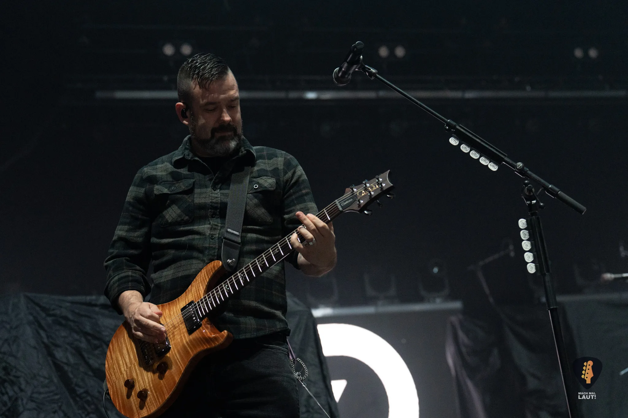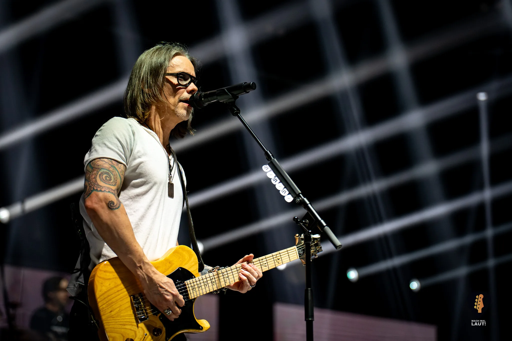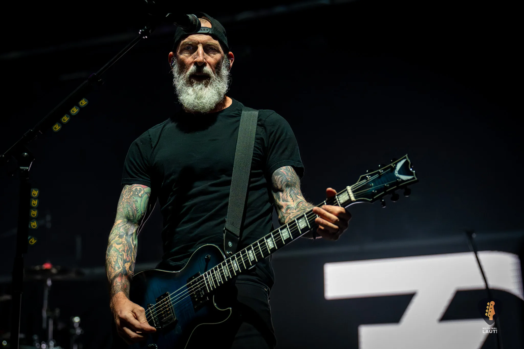 Als schließlich Alter Bridge die Bühne betraten, wurde es auch endlich richtig laut in der Halle. Nachdem die Halle bereits den ganzen Abend eingenebelt wurde, kam jetzt die volle Stärke der starke Lichtshow zum Vorschein, die die Alter Bridge Performance begleitete. Die Band war ebenfalls sichtlich motiviert und freute sich wieder gemeinsam auf Tour zu sein. Die Setlist war ein richtig guter Mix aus allen Phasen der Bandgeschichte. Nach dem Beginn mit Silent Divide vom neuen Album Alter Bridge ging es direkt 13 Jahre zurück zum Album Fortress mit Addicted To Pain. Fortress stellte einen echten Fanmoment dar. Der Song wurde das erste Mal seit 2017 wieder live gespielt und wurde zuvor über eine Abstimmung auf dem Instagram Kanal der Band von den Fans für diesen Abend abgestimmt. Bei Burn it down durfte Mark Tremonti das erste Mal an diesem Abend den Gesang übernehmen.