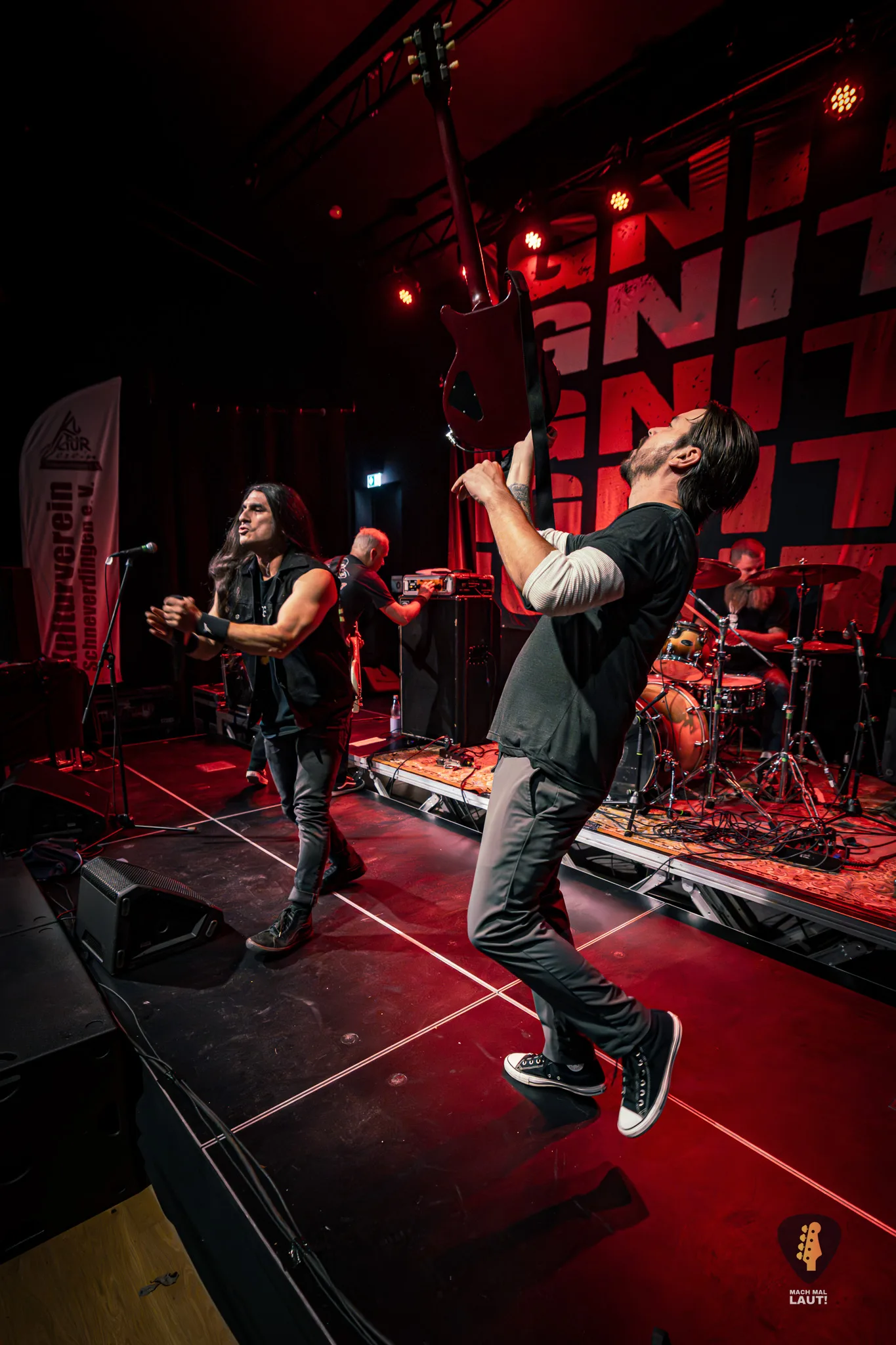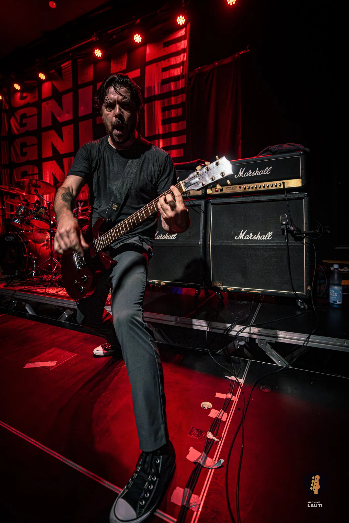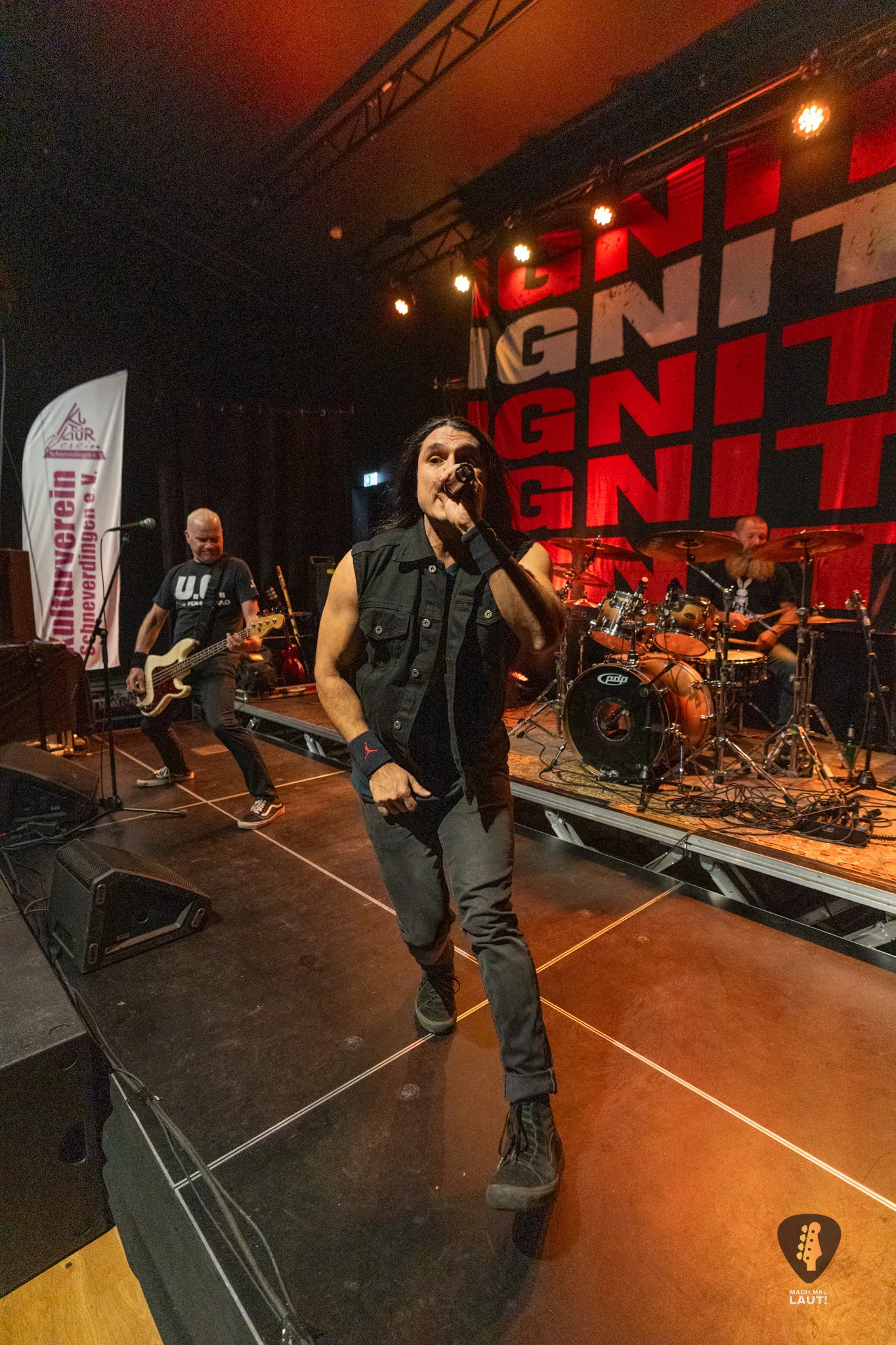 Das Publikum feierte jeden Song ab und der Raum heizte sich schnell auf. Draußen wurde es dagegen immer kälter und es fiel sogar der erste Schnee des Jahres und hüllte Schneverdingen in Weiß. Bassist Brett huldigte im Set auch dem Support Act Ash Return, die sie schon seit der Zeit, als sie noch Miozän waren, kennen und damals bereits gemeinsam die Bühnen der Republik bespielten. Zum Ende des Sets stellte Brett auch die restlichen Mitglieder von Ignite noch einmal vor, auch wenn jede:r Anwesende diese natürlich kannte. Beim vorletzten Song Fear is our Tradition wurde es dann richtig wild, als gleich mehrere Besucher:innen auf die flache Bühne stiegen, um von dort ins Publikum zu springen. Und auch Sänger Eli ließ es sich nicht nehmen, selbst spontan auf die Menge zu springen. In der Zugabe spielten sie Live for Better Days, ein Song, der mich immer wieder emotional berührt. Eli und Brett gingen für den Anfangsteil ins Publikum und sagen gemeinsam mit den Besucher:innen bevor sie zurückkehrten und den Rest des Songs alle gemeinsam spielten.