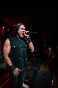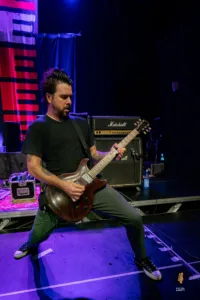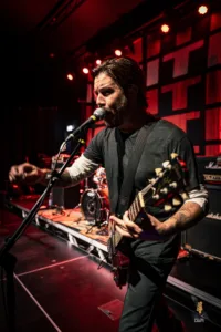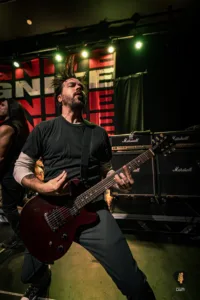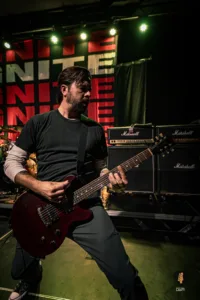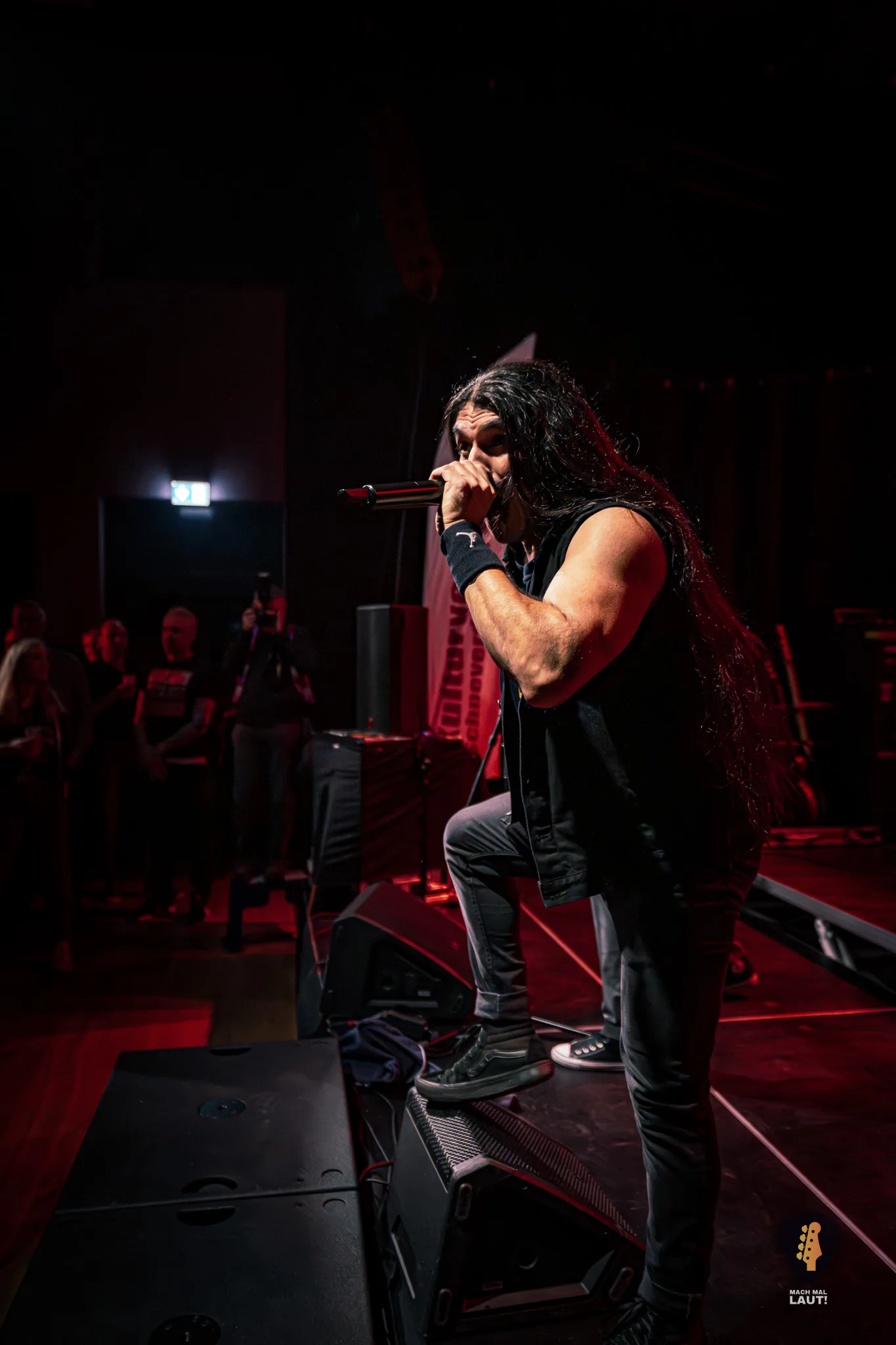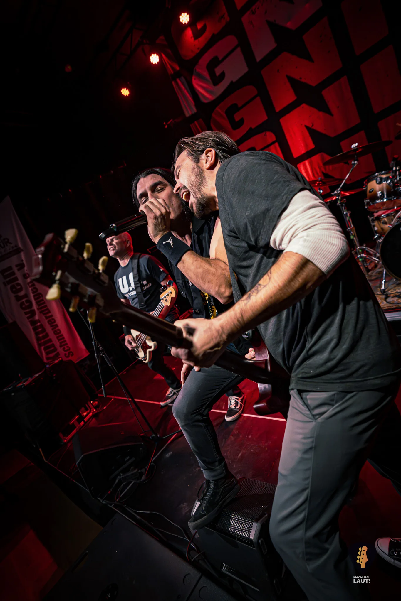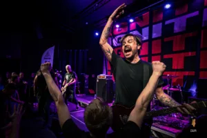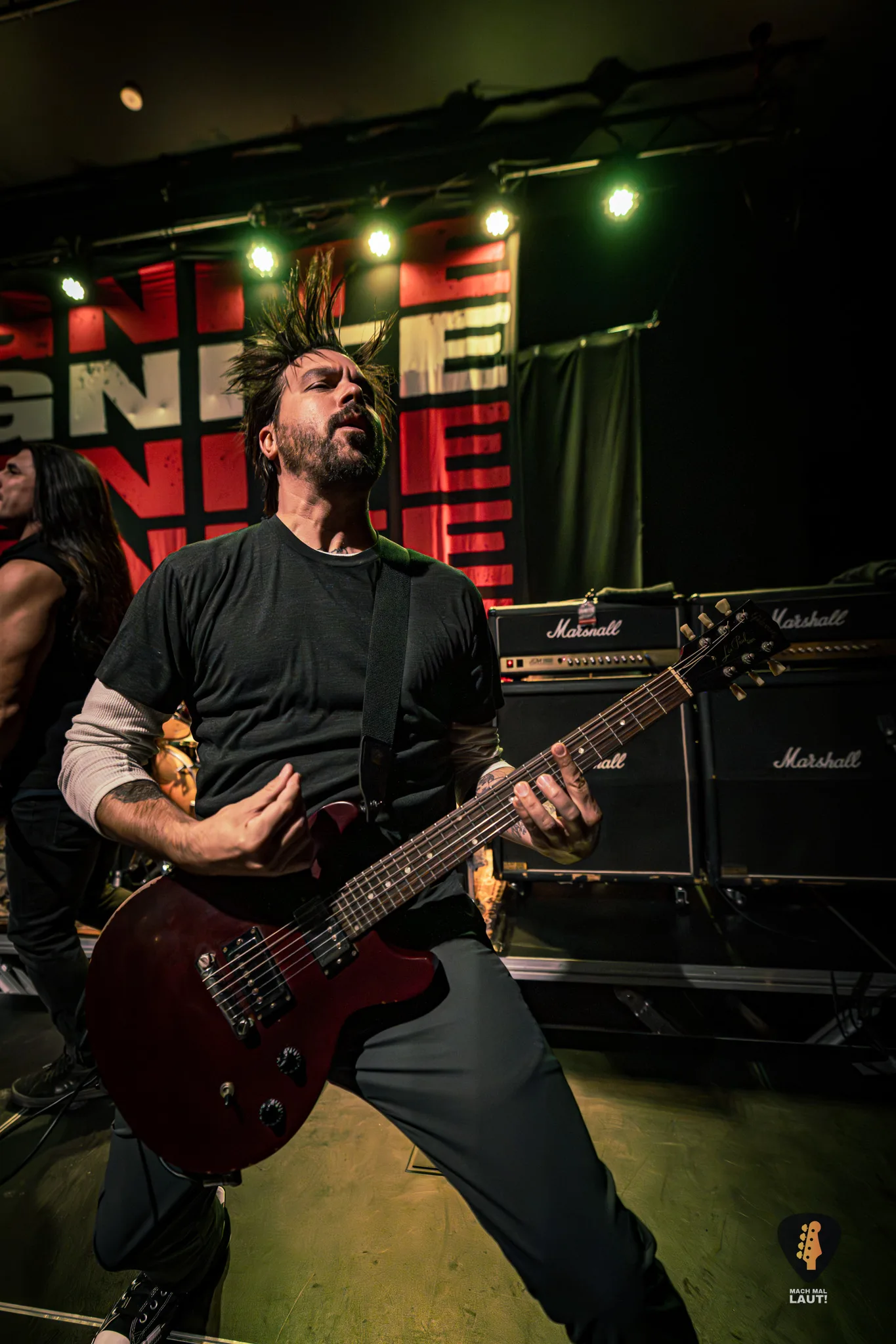 Das Publikum feierte jeden Song ab und der Raum heizte sich schnell auf. Draußen wurde es dagegen immer kälter und es fiel sogar der erste Schnee des Jahres und hüllte Schneverdingen in Weiß. Bassist Brett huldigte im Set auch dem Support Act Ash Return, die sie schon seit der Zeit, als sie noch Miozän waren, kennen und damals bereits gemeinsam die Bühnen der Republik bespielten. Zum Ende des Sets stellte Brett auch die restlichen Mitglieder von Ignite noch einmal vor, auch wenn jede:r Anwesende diese natürlich kannte. Beim vorletzten Song Fear is our Tradition wurde es dann richtig wild, als gleich mehrere Besucher:innen auf die flache Bühne stiegen, um von dort ins Publikum zu springen. Und auch Sänger Eli ließ es sich nicht nehmen, selbst spontan auf die Menge zu springen. In der Zugabe spielten sie Live for Better Days, ein Song, der mich immer wieder emotional berührt. Eli und Brett gingen für den Anfangsteil ins Publikum und sagen gemeinsam mit den Besucher:innen bevor sie zurückkehrten und den Rest des Songs alle gemeinsam spielten.