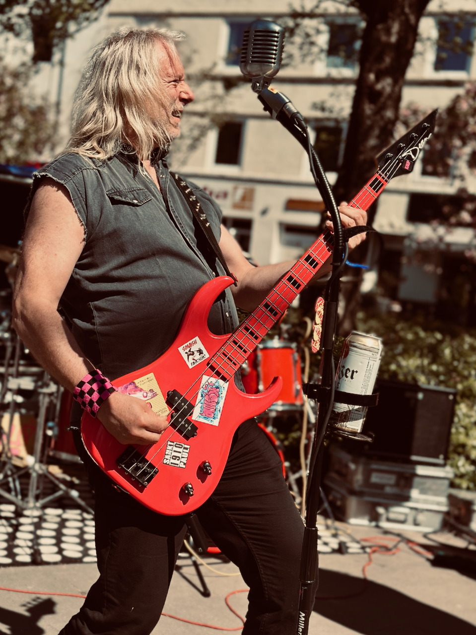 Auch die Läufer auf der Strecke zeigten sich sichtlich unterhalten von den rotzigen Klängen der E-Gitarren. Einige rissen beim Laufen die Metal-Finger in die Luft, während andere sogar kurz zur Band liefen, um ein Foto zu machen. Zu diesem Zeitpunkt hatten die Läufer immerhin bereits ca. 25 KM des Laufs hinter sich. Bassist Detlef und Gitarrist Martin machten sich zusätzlich immer mal wieder auf den Weg zur Straße um die Läufer direkt auf der Strecke zu motivieren. Schlagzeuger Lars konnte seinen Posten nicht so einfach verlassen.