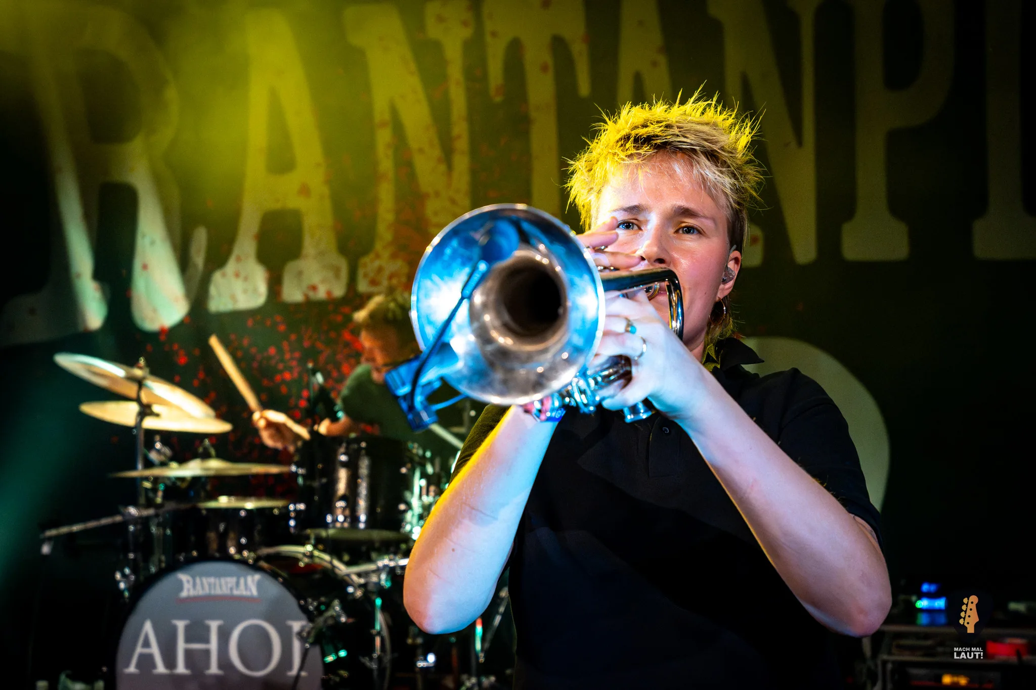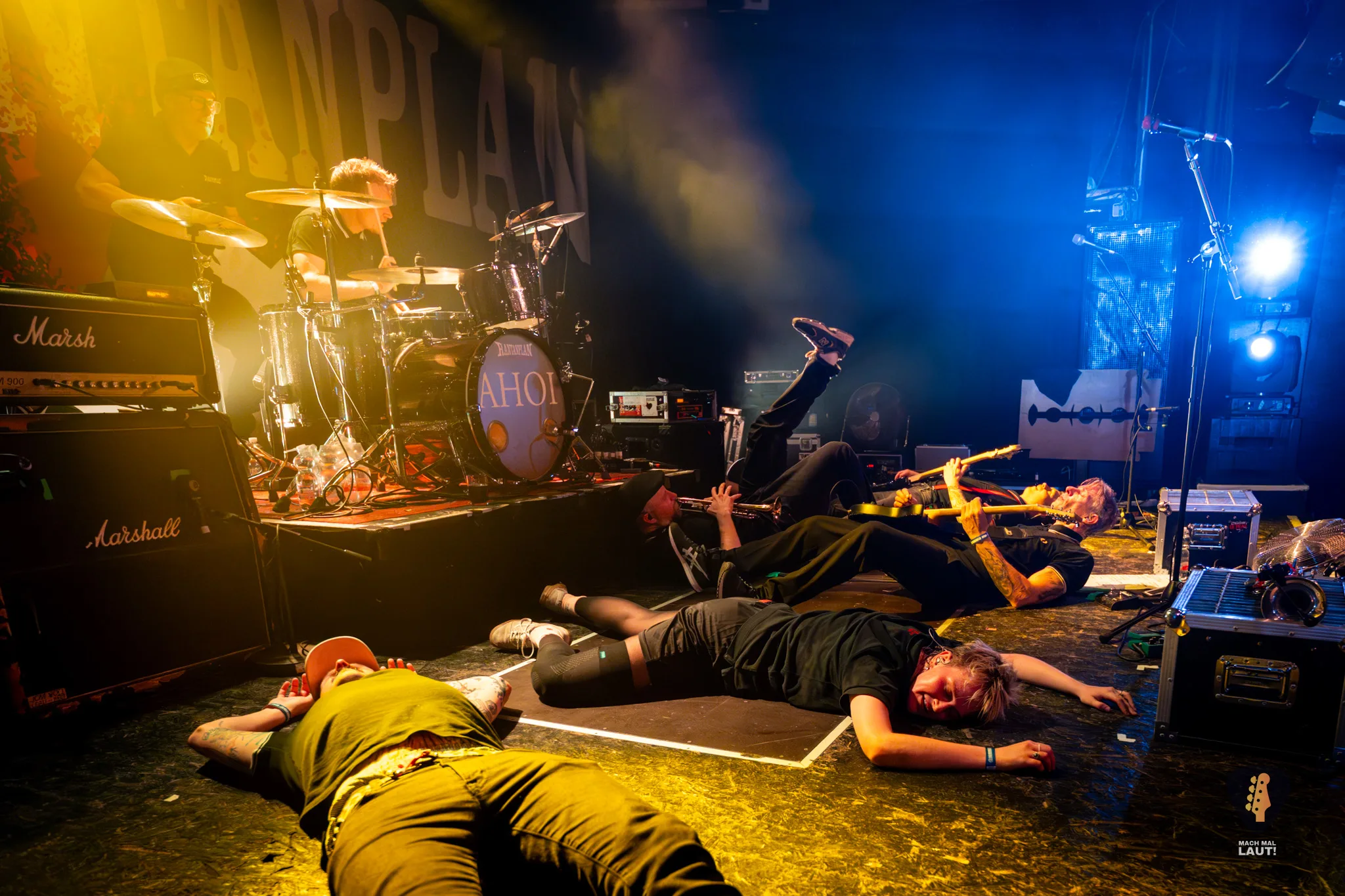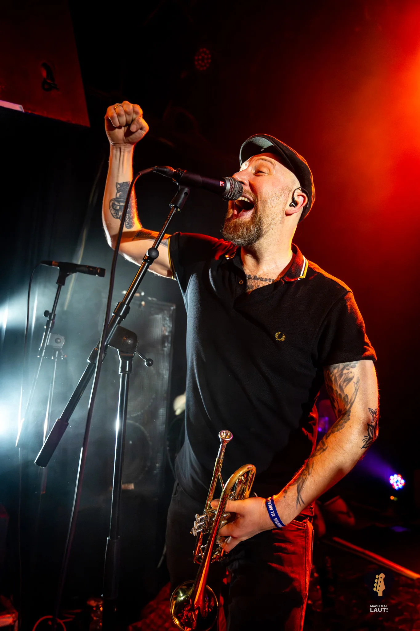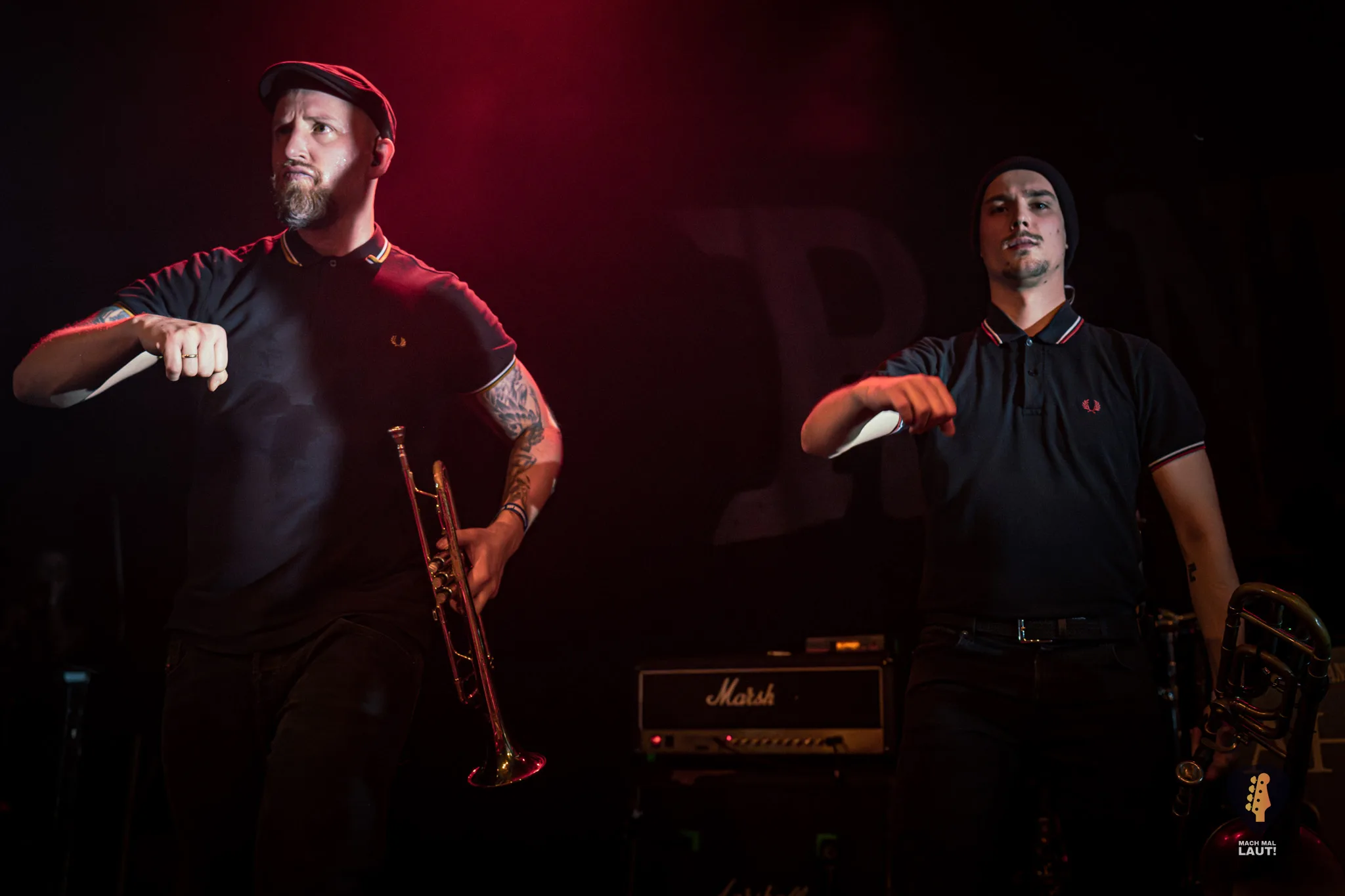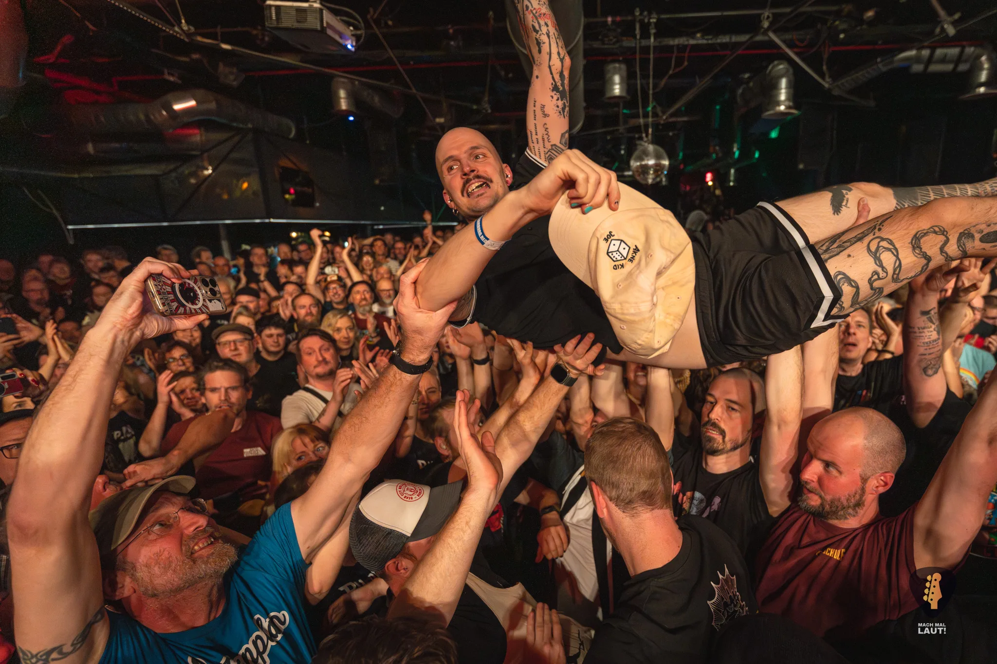 Dann war es so weit – Das Rudel betrat die Bühne und machte von der ersten Minute an klar, warum dieses Konzert zu den festen Terminen im Hamburger Konzertkalender gehört. Die 10. Ausgabe fühlte sich nicht wie ein normales Konzert an, sondern wie ein großes Familientreffen von Band und Publikum. Die Band um Sänger Torben tauschte auf der Bühne immer wieder die Positionen und interagierte mit dem Publikum. Besonders die Trompeten- und Posaunenfraktion aus Lea, Ulf und David tanzte und sprang wild auf der Bühne umher und ließ sich auch nicht davon abhalten einen Ausflug ins Publikum zu machen. Bassist Pedi, der für ein paar Songs die Gitarre vom Haupt-Bassisten Kalle übernahm sprang sogar für einen Stage-Dive von der Bühne aufs Publikum. Schlagzeuger Marlon gab am Schlagzeug alles und war am Ende wie alle Bandmitglieder sichtlich durchgeschwitzt. Müde wurden sie während des Sets dennoch nicht und gaben weiter Vollgas.